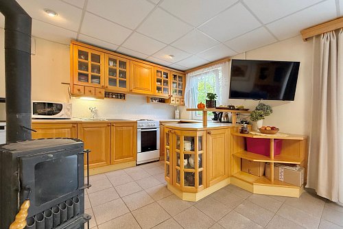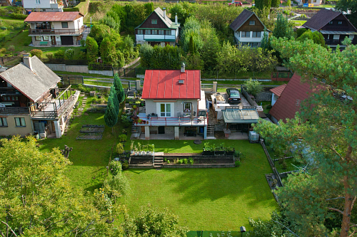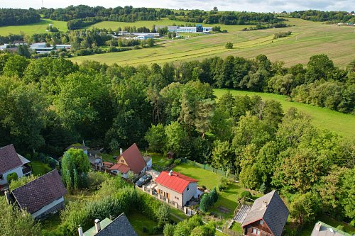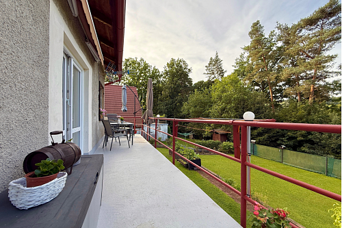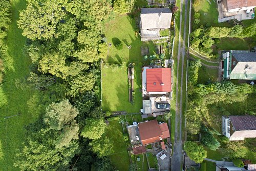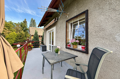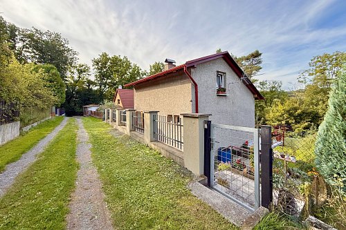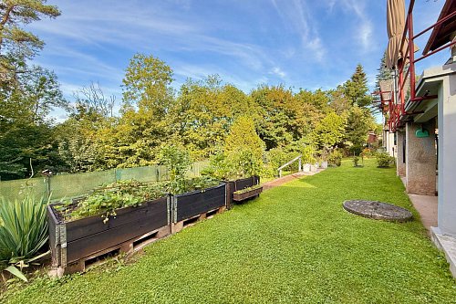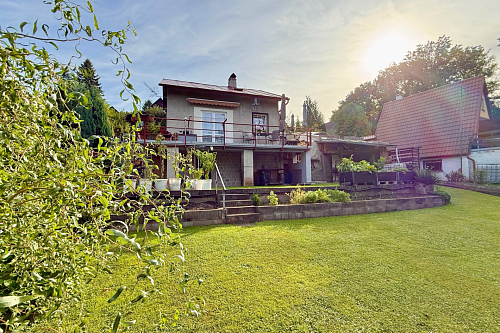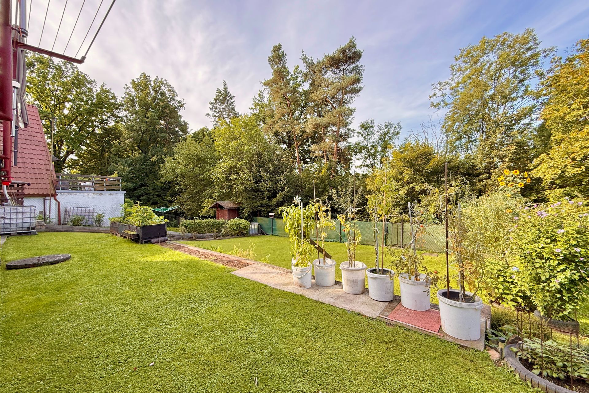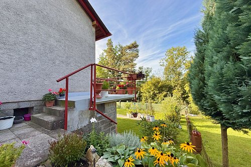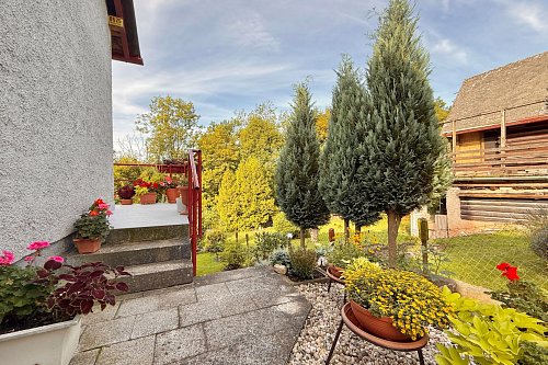 Pozemek je svažitý směrem od chaty a pomocí stěn členěný do tří výškových úrovní. Zahrada je pečlivě udržovaná a kompletně oplocená.