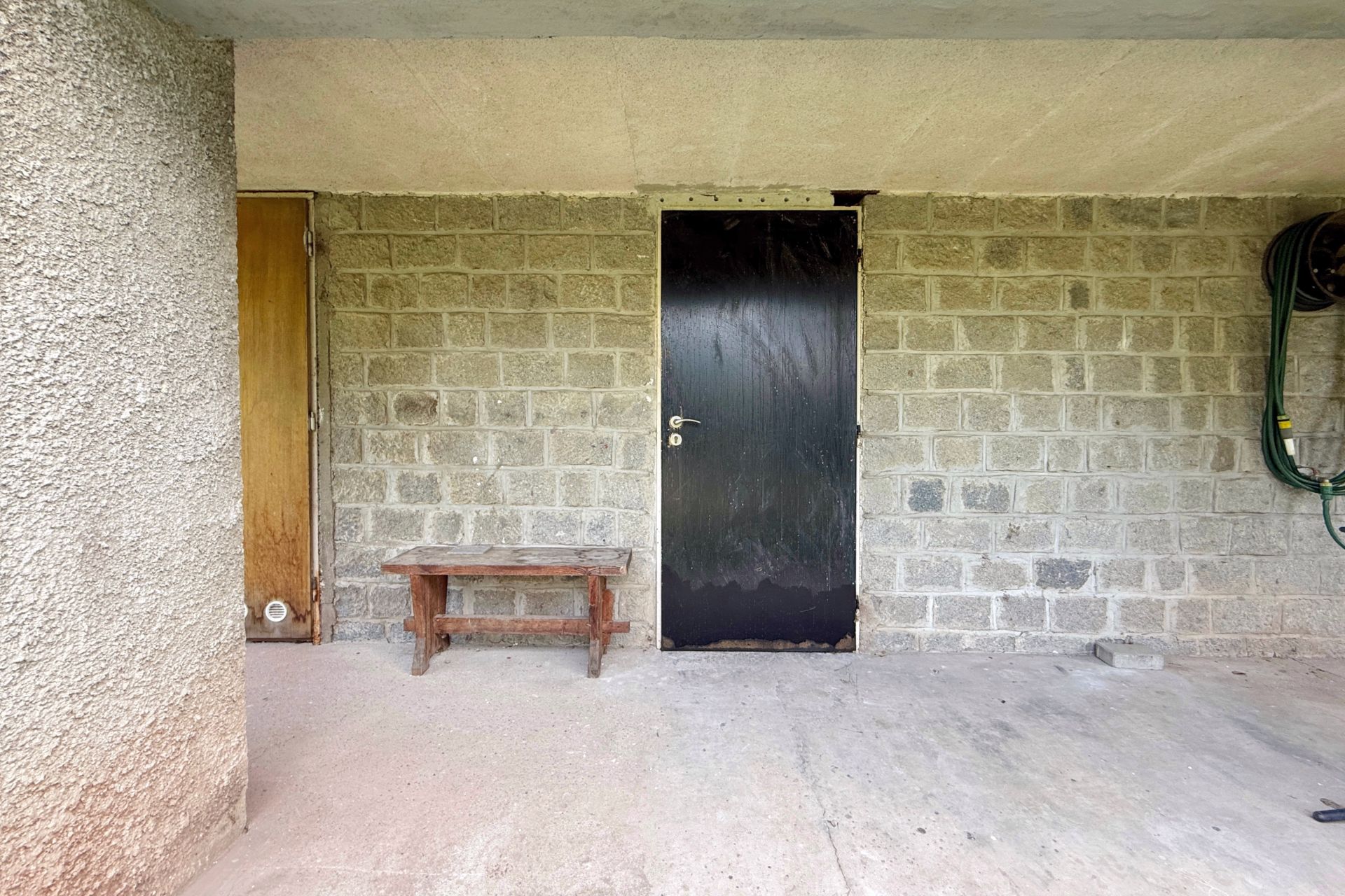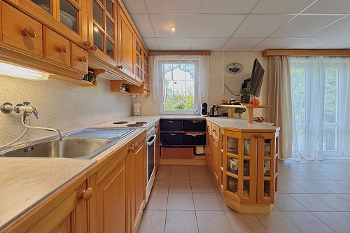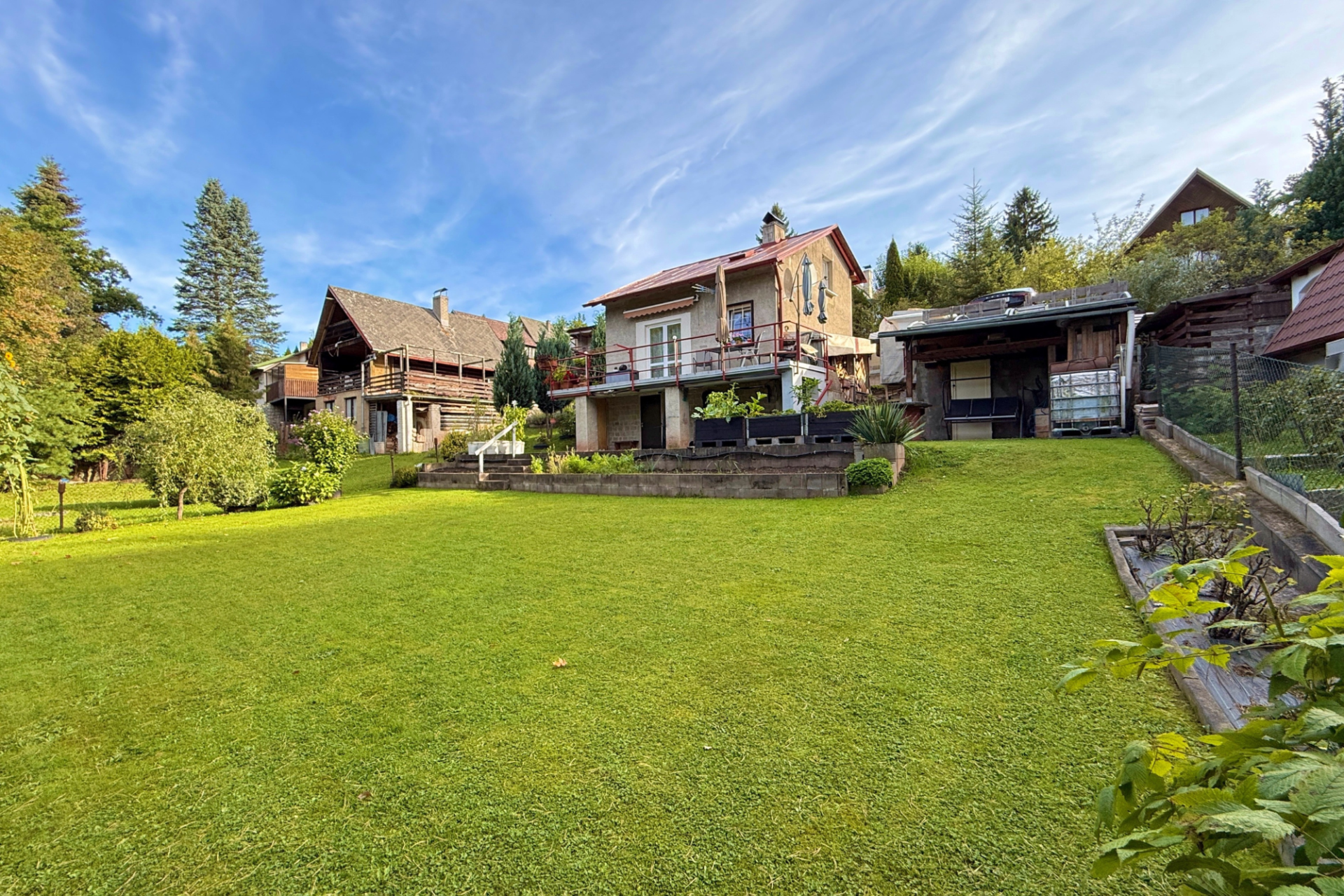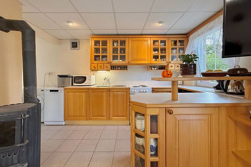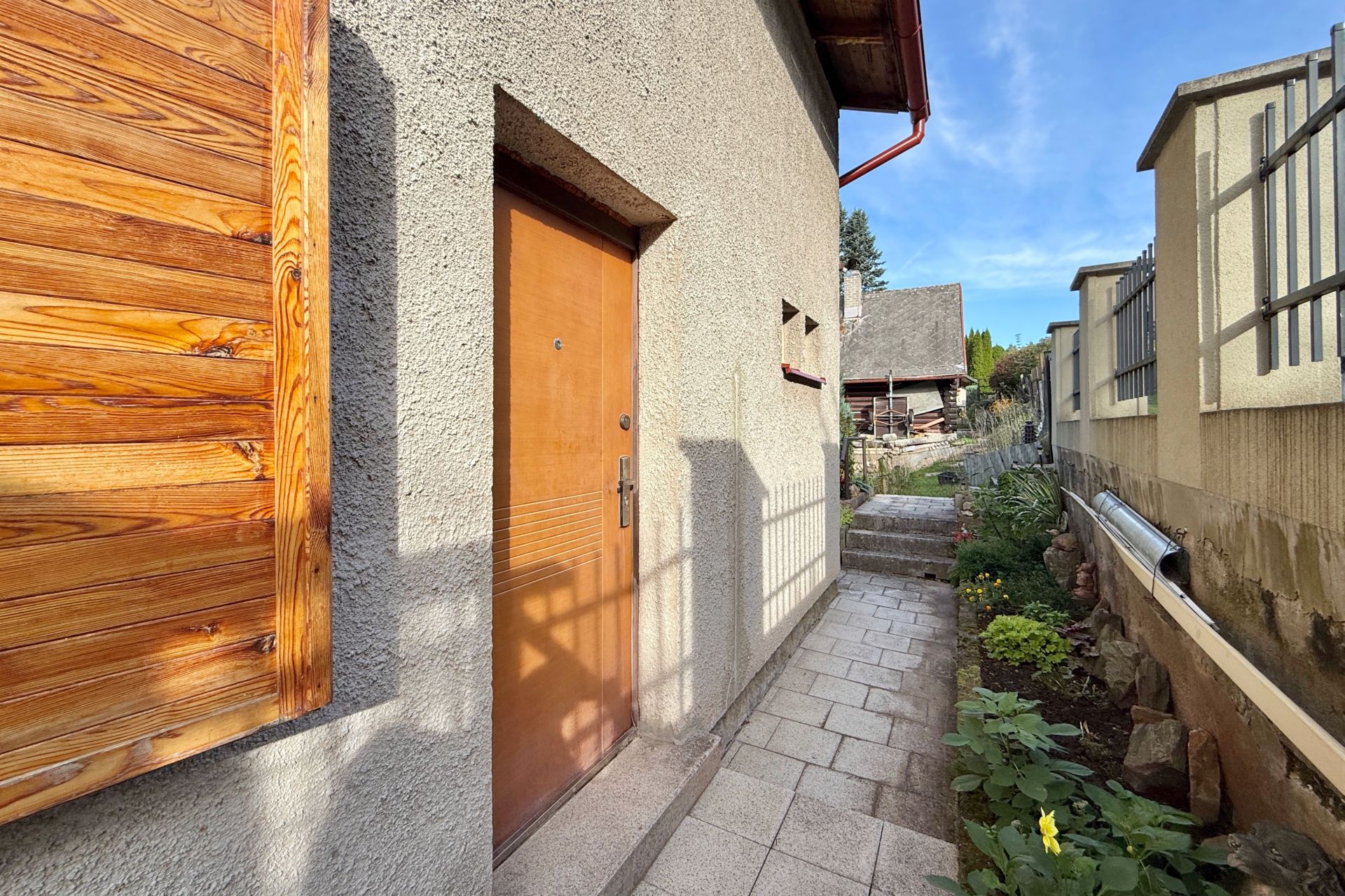 Pozemek je svažitý směrem od chaty a pomocí stěn členěný do tří výškových úrovní. Zahrada je pečlivě udržovaná a kompletně oplocená.
