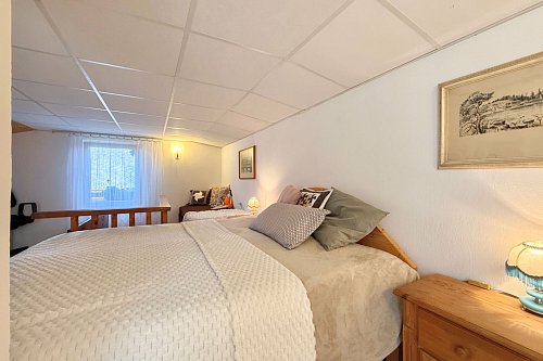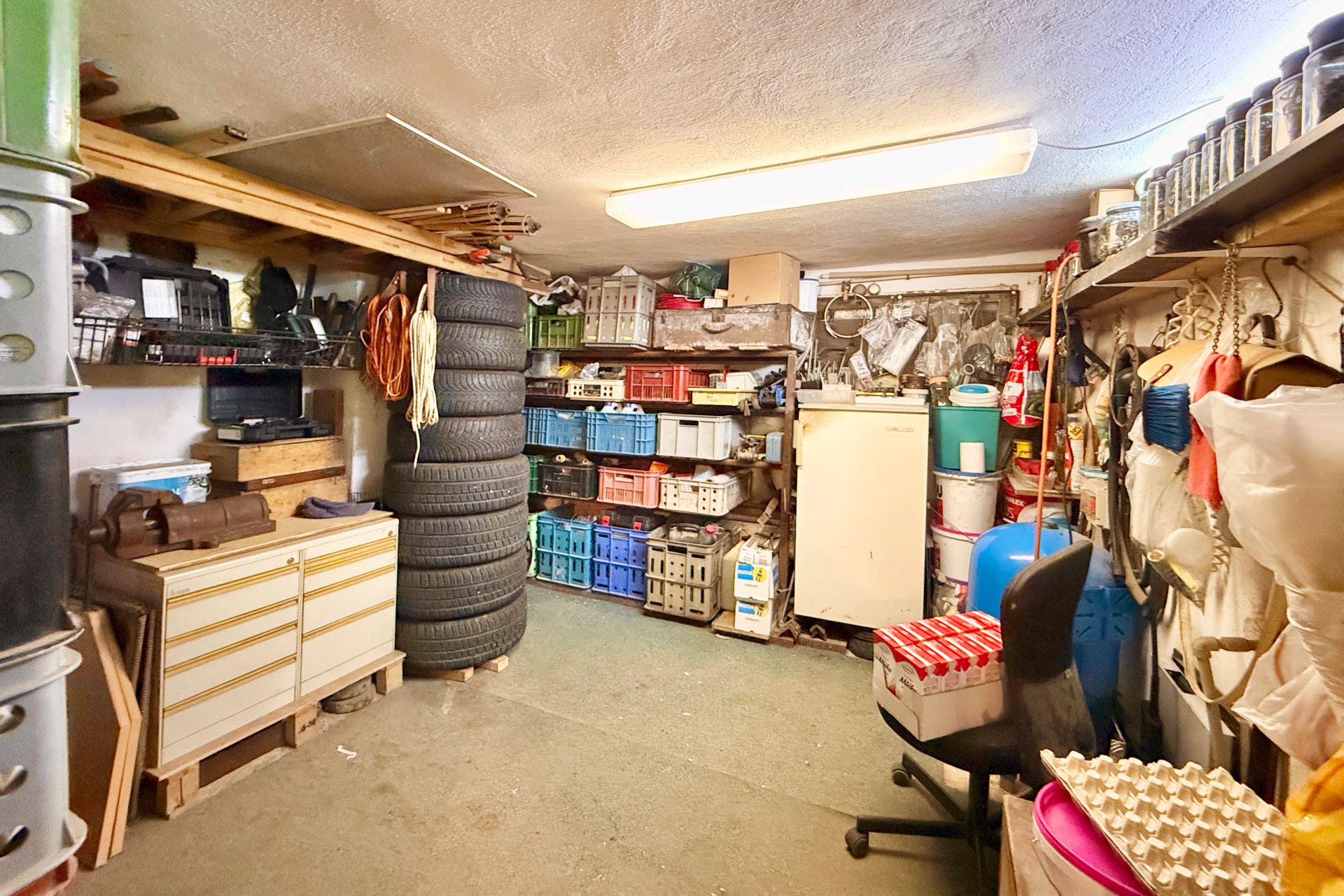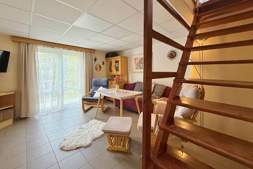 V přízemí chaty se nachází vstupní předsíň (3,3 m²), koupelna (1,7 m²) a obývací pokoj s kuchyňským koutem (27,3 m²), ze kterého je vstup na prostornou terasu (16,2 m²) orientovanou na jihozápad s výhledem do zahrady a okolí. Z obývacího pokoje vedou schody do podkroví, kde je ložnice (23,3 m²) a šatna (10,1 m²). Chata je podsklepená (celkové rozměry 5,8 x 3,3 m), přístup do sklepů je ze zahrady pod terasou. Vedle chaty se nachází parkovací plocha pro jedno auto.