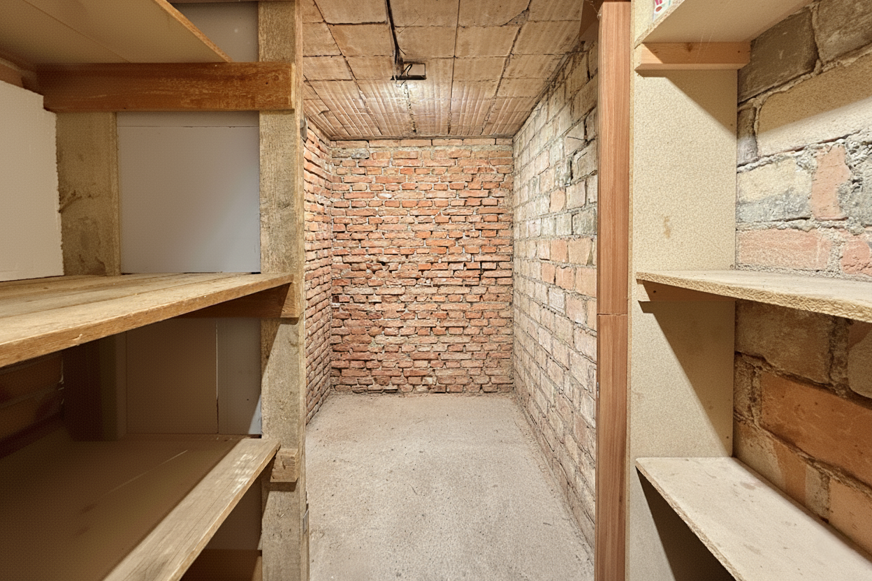 K bytu náleží tři prostorné sklepy v 1. podzemním podlaží – prázdný sklep o výměře 13,8 m², sklep s kotlem o výměře 7,6 m² a sklad na tuhá paliva o výměře 4,6 m². Celkem tak máte k dispozici více než 26 m² úložného prostoru pro dřevo, nářadí či sezónní vybavení.
