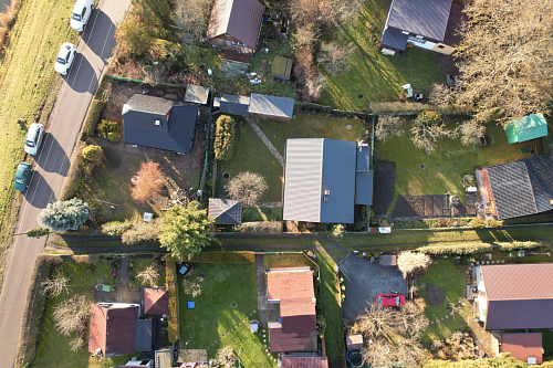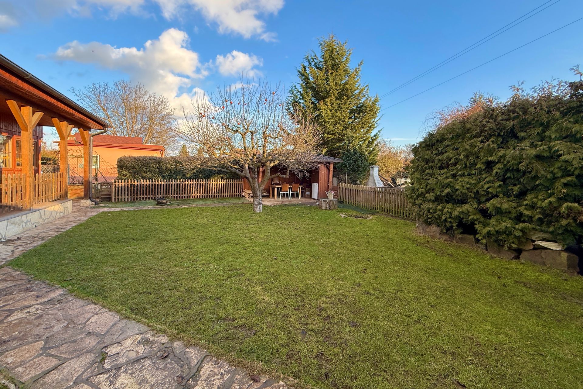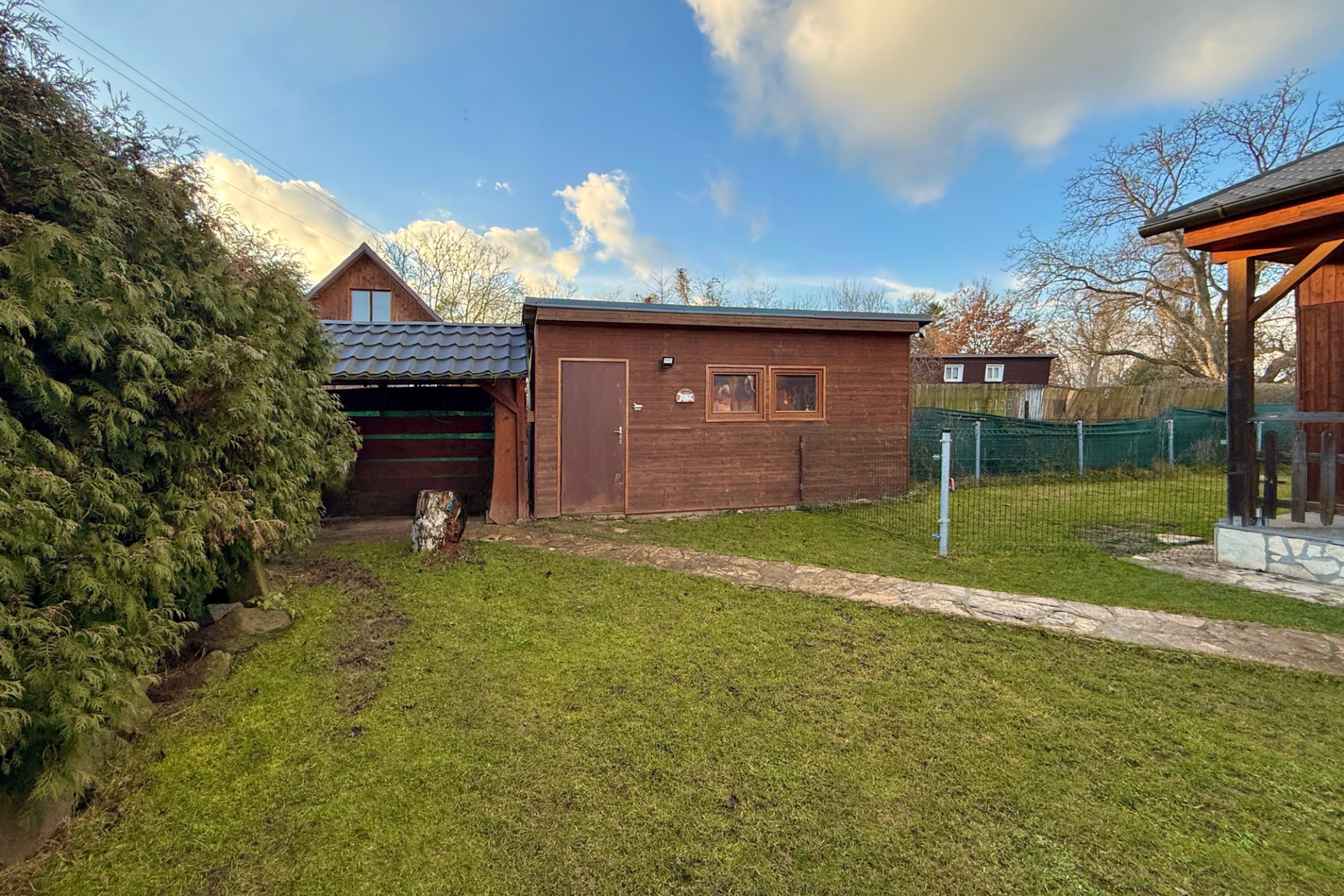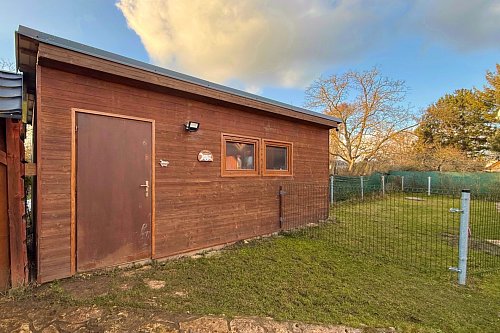 Na zahradě o rozloze 407 m² se nachází venkovní kryté posezení a dílna (11 m²). Vzrostlá zeleň vytváří příjemné soukromí a klidné prostředí. Příjezd k chatě je po asfaltové komunikaci, posledních 30 metrů tvoří nezpevněná cesta.