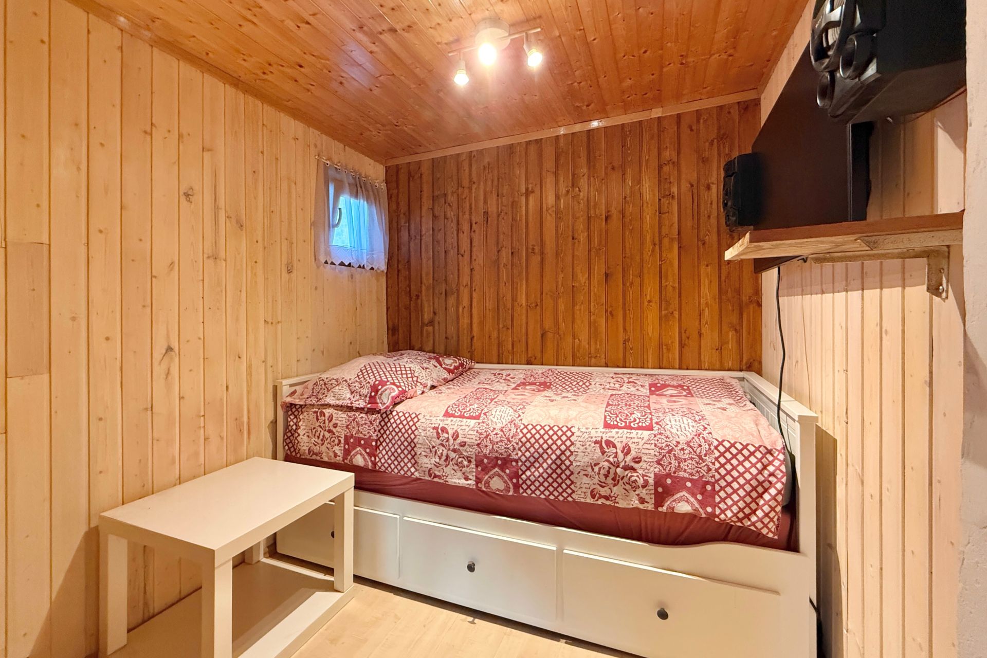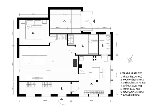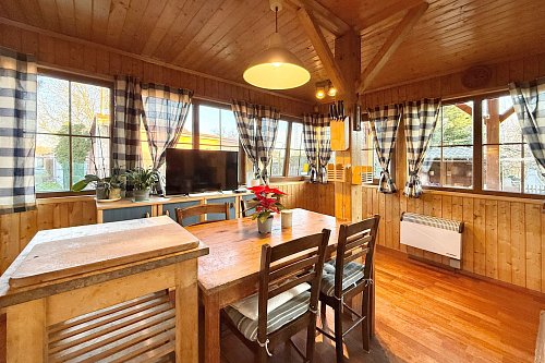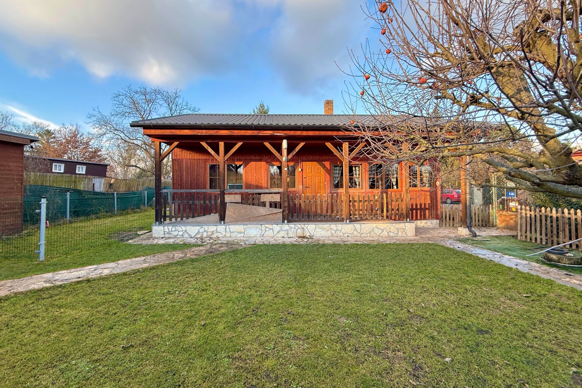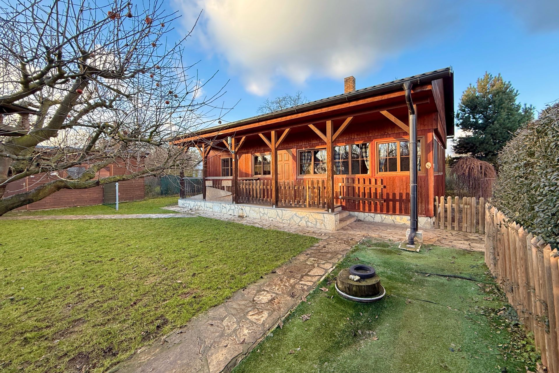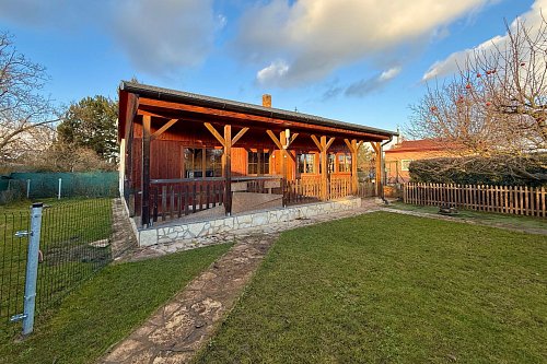 Vstup do chaty vede přes zastřešenou verandu, využitelná i jako příjemné posezení. Uvnitř je dominantou kuchyně a prostorný obývací pokoj, dále je k dispozici ložnice, menší pokoj a plnohodnotná koupelna. Chata s přehledem ubytuje celou rodinu. Součástí je garáž, fungující jako sklad.
