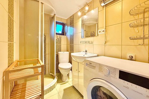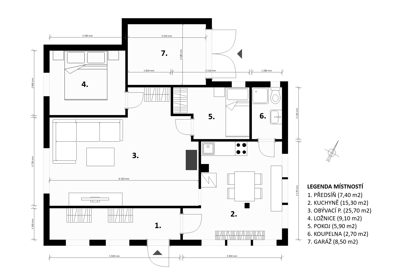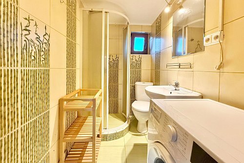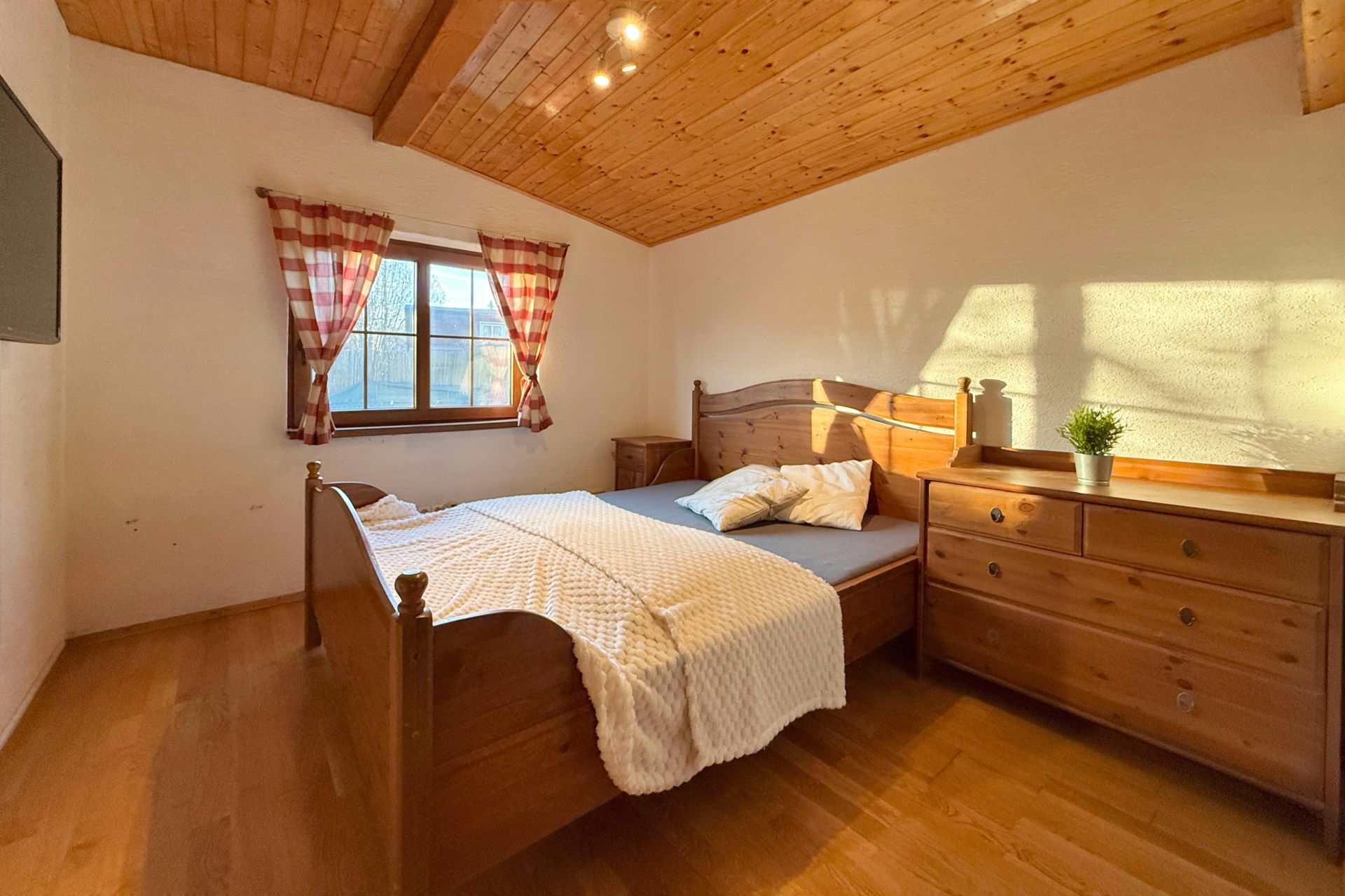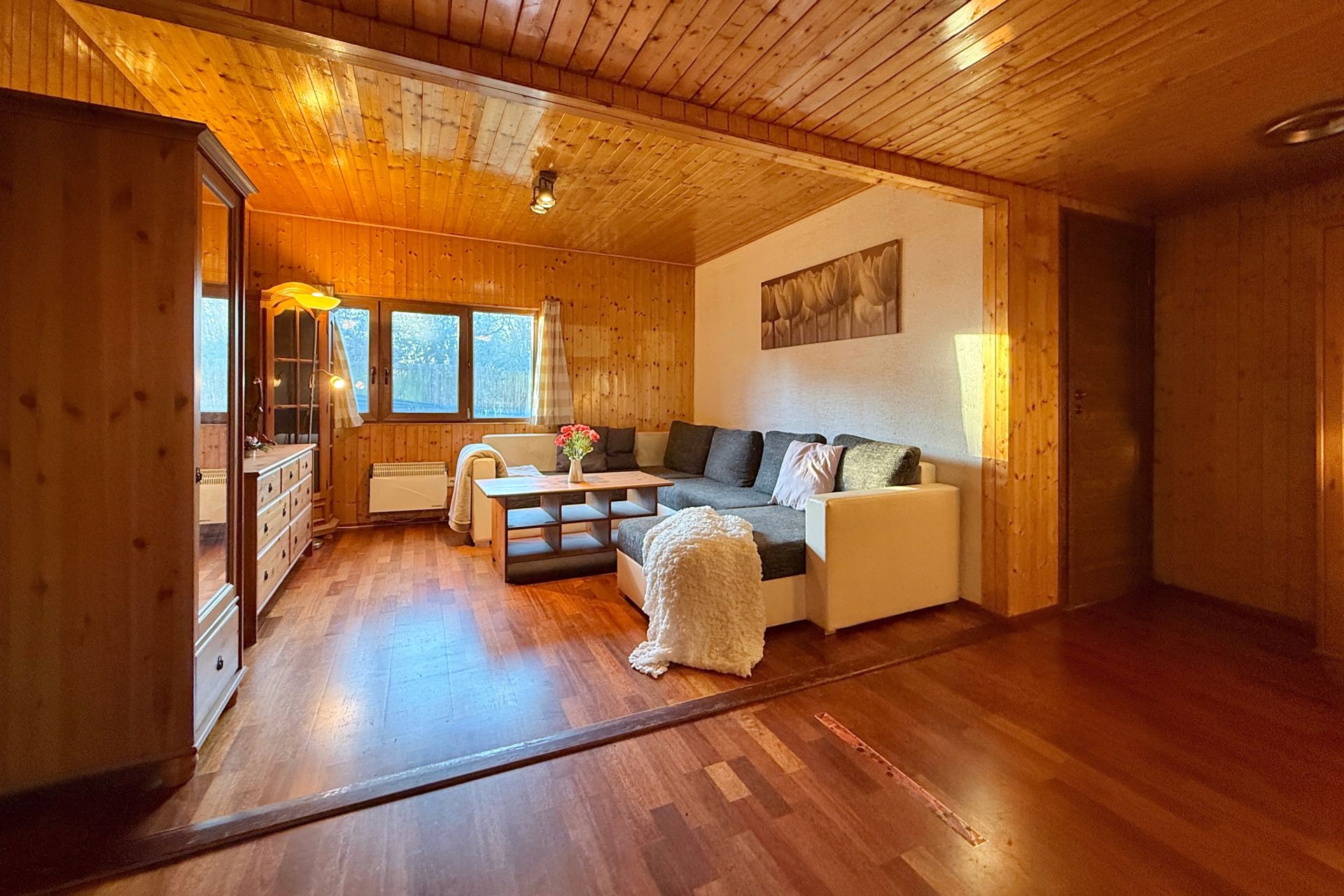 Vstup do chaty vede přes zastřešenou verandu, využitelná i jako příjemné posezení. Uvnitř je dominantou kuchyně a prostorný obývací pokoj, dále je k dispozici ložnice, menší pokoj a plnohodnotná koupelna. Chata s přehledem ubytuje celou rodinu. Součástí je garáž, fungující jako sklad.