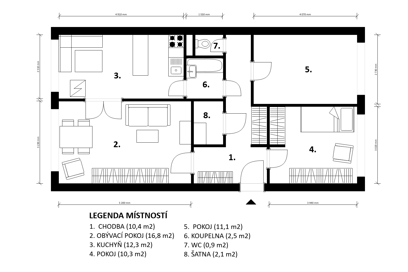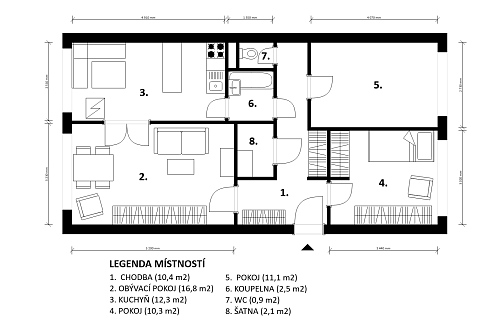 Celková plocha bytu vychází z původní Smlouvy o nájmu družstevního bytu (byt je nově převeden do osobního vlastnictví), rozměry jednotlivých místností jsou změřeny laserovým metrem.