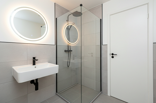 Vstup do bytu je přes prostornou chodbu s vestavnou skříní. Z chodby je dále vstup do všech obytných místností. Obývací pokoj (16,8 m²) společně s kuchyní (12,3 m²) jsou orientovány na jihovýchod do zeleně a do ulice Střelničná. Oba pokoje (11,1 m² a 10,3 m²) jsou orientovány na severozápad do ulice Třebenická. Koupelna s vanou a umyvadlem je průchozí z kuchyně a chodby. WC je samostatné. K bytu náleží komora přímo naproti bytu, dále sklep v suterénu.