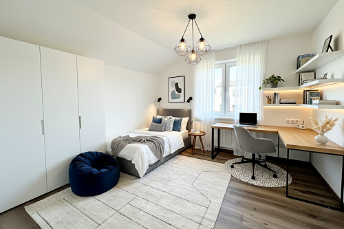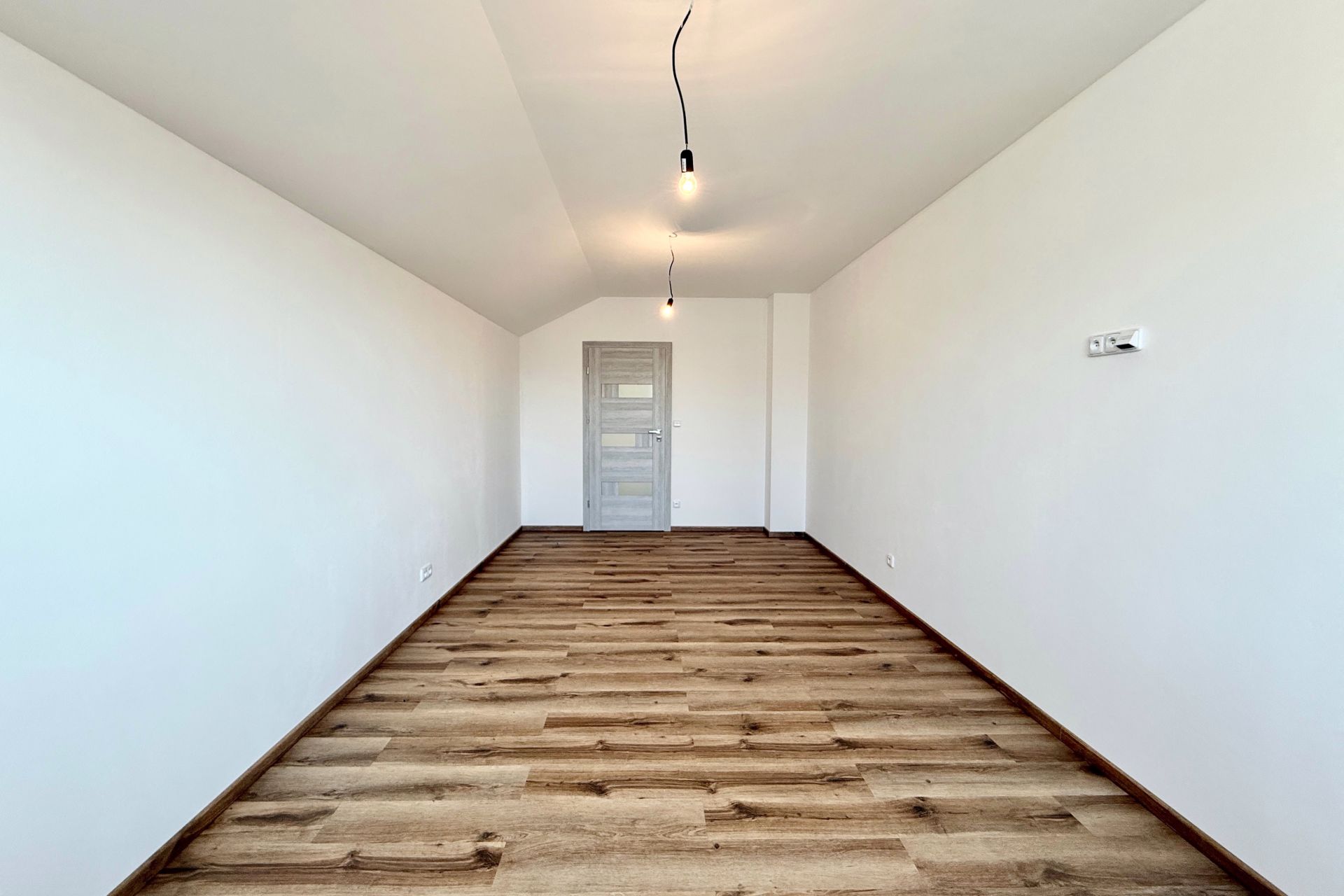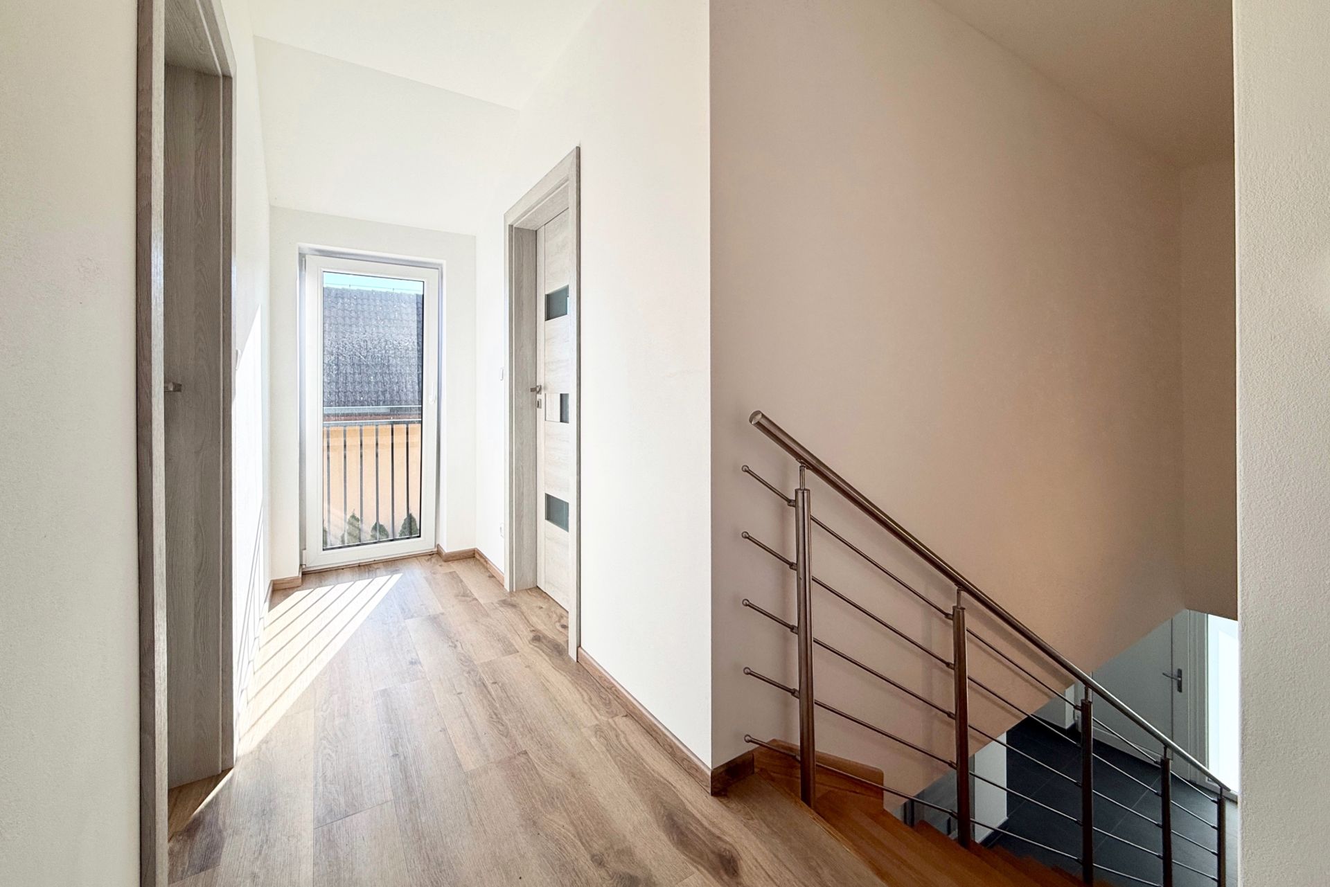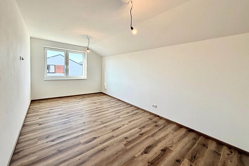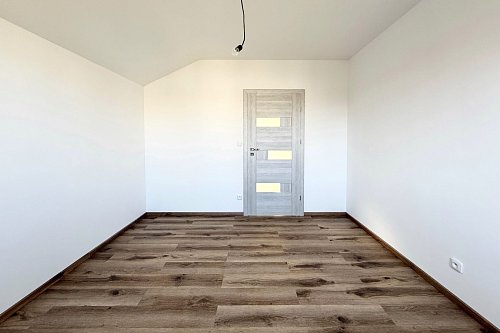 V patře jsou dva pokoje, velkorysá ložnice a koupelna s vanou, sprchovým koutem a WC. Dále pak šatna, která propojuje chodbu s koupelnou.