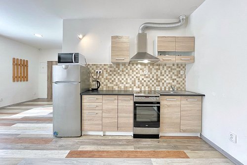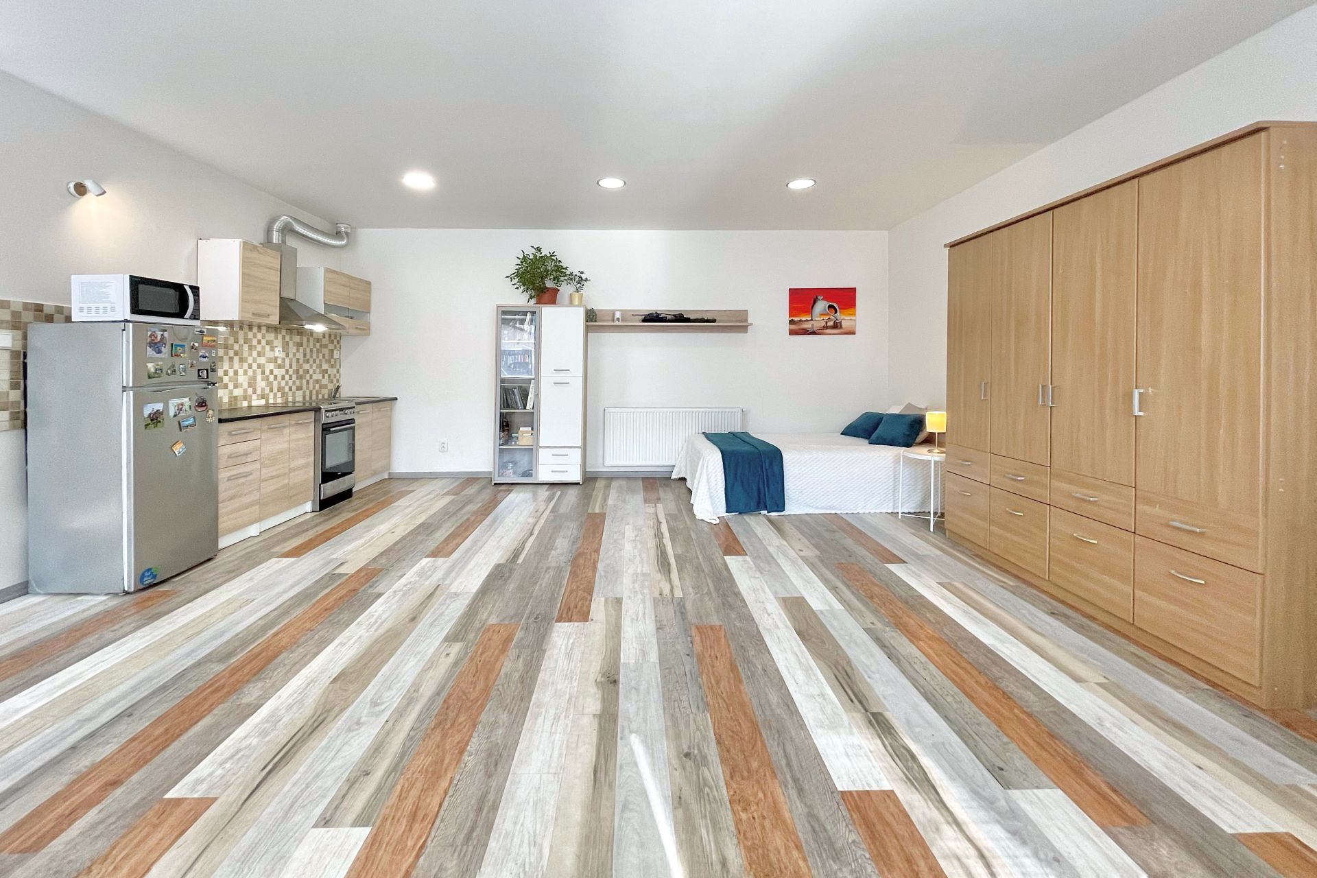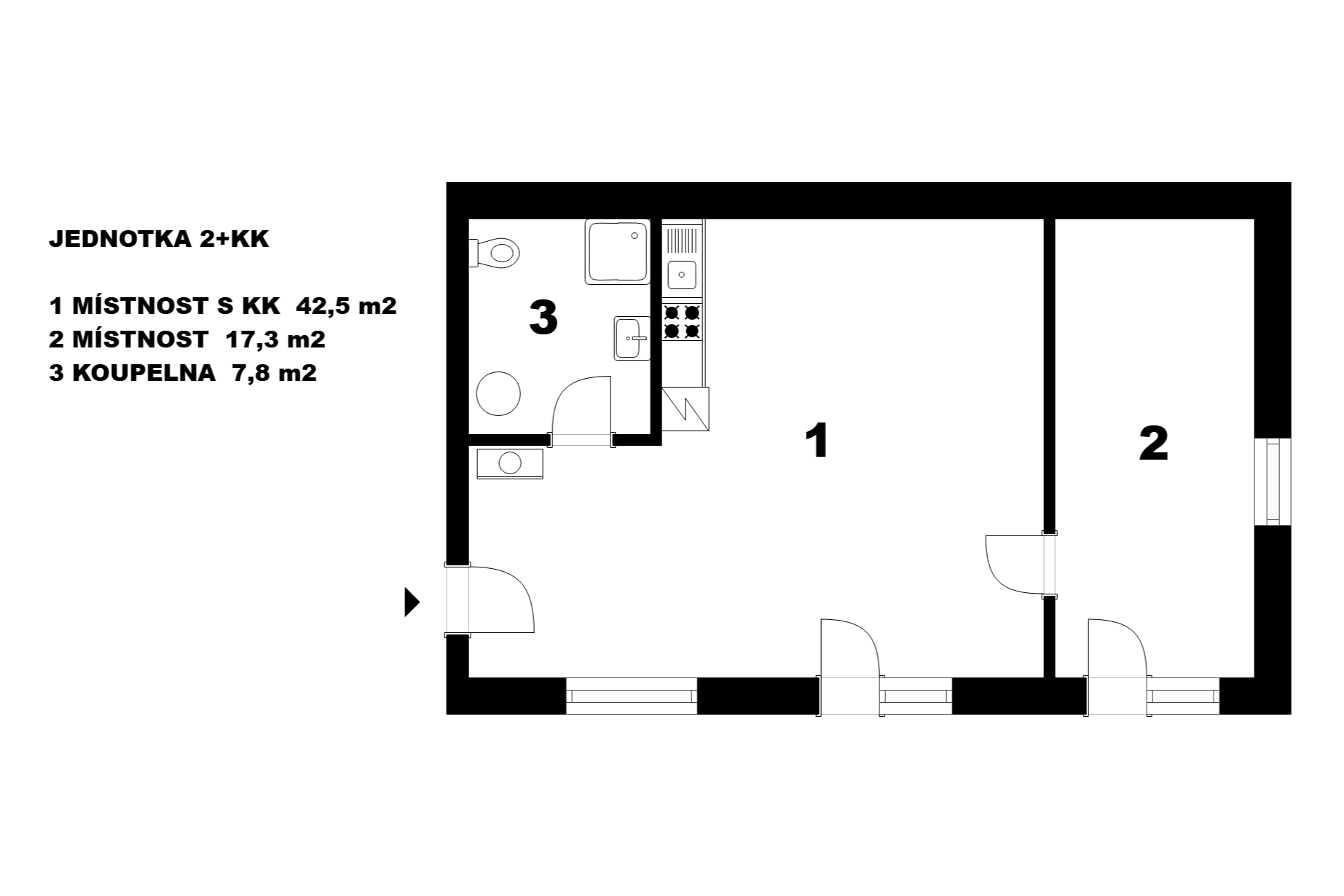 Prostor se skládá ze dvou hlavních místností – větší o ploše 42,5 m², ve které je umístěna kuchyňská linka, a menší o velikosti 17,3 m². Dále je k dispozici koupelna se sprchovým koutem, toaletou a umyvadlem. Prostor se nabízí nezařízený.