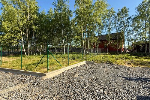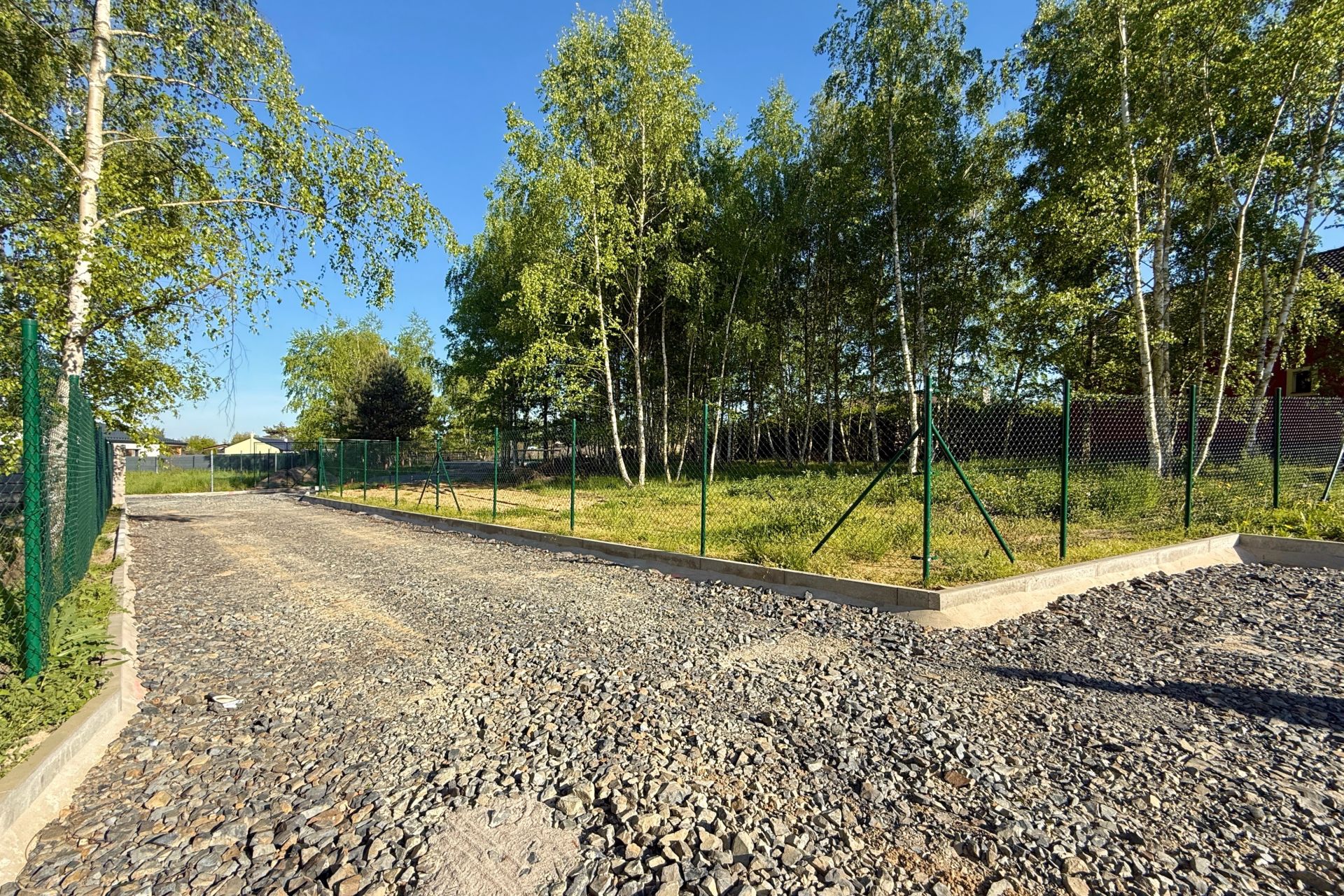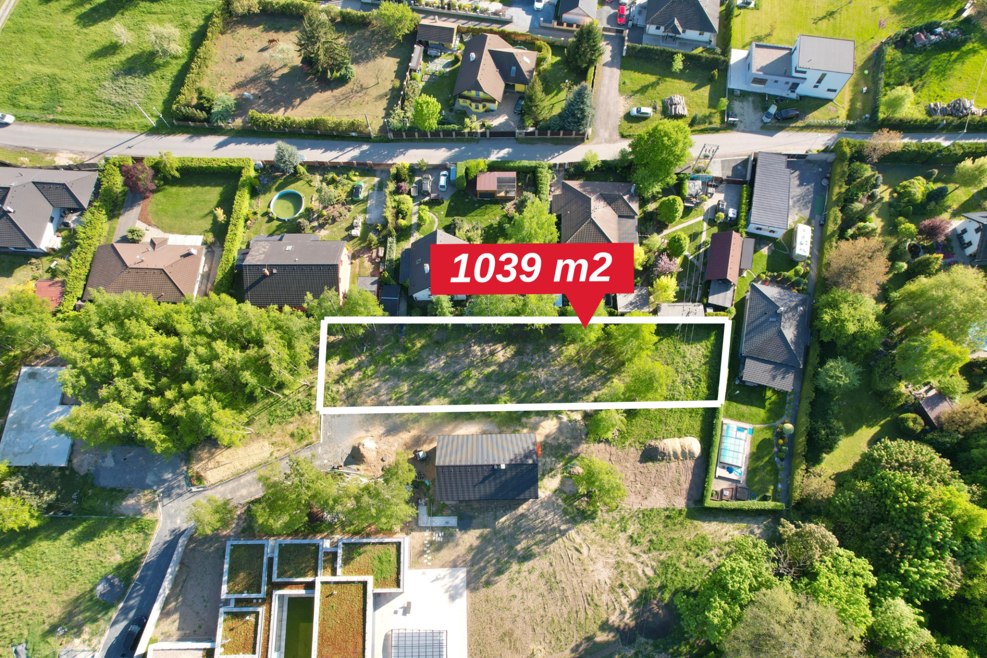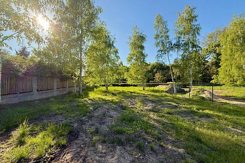 Pozemek má rozměry 15,5 m × 67 m (průměrné hodnoty), je kompletně rovinný a ze všech stran oplocený. Ze tří stran pozemek sousedí s rodinnými domy, z kratší strany sousedí se zalesněnou částí sousedního pozemku. K dispozici jsou přípojky vody, elektřiny a kanalizace.