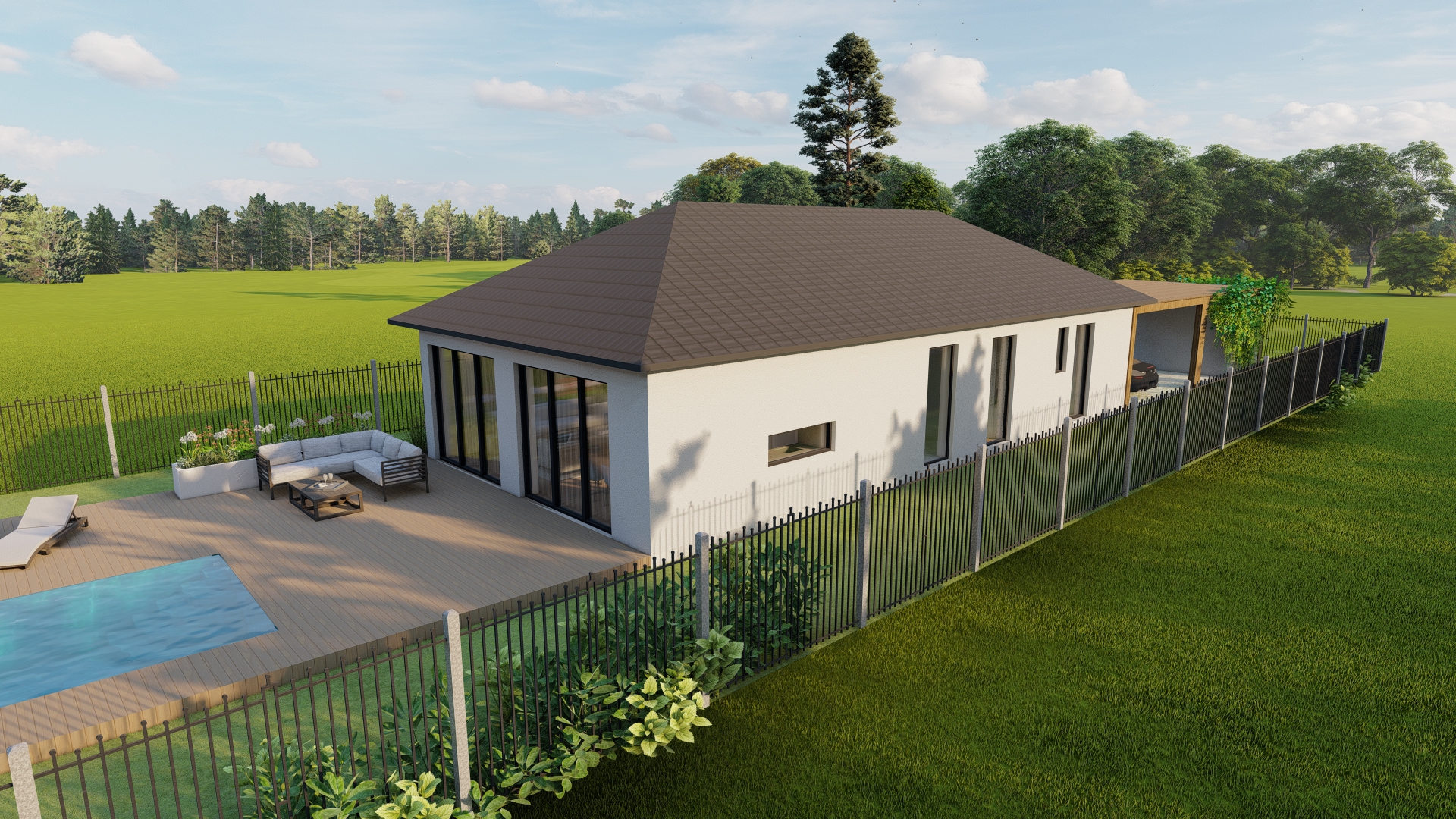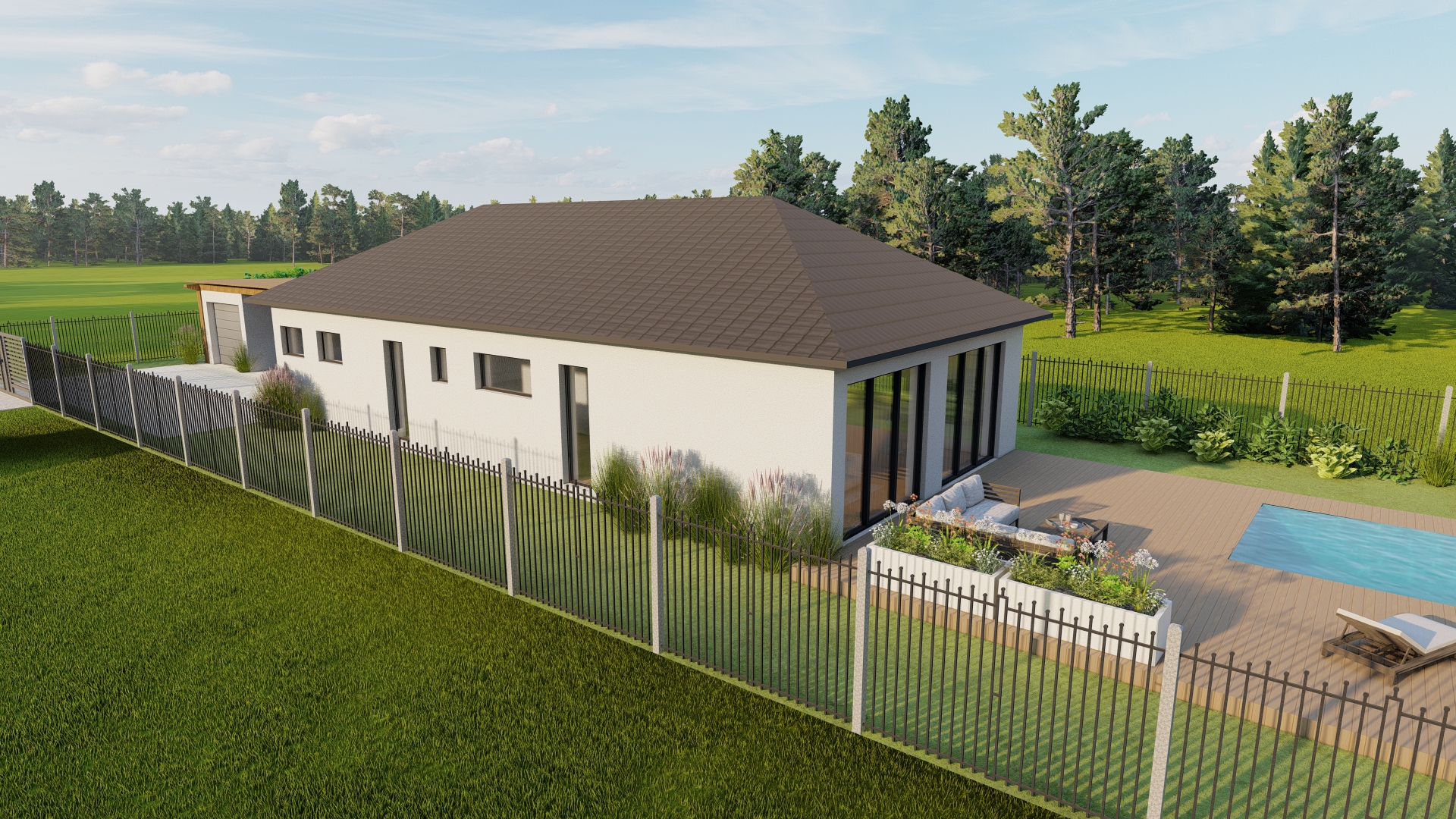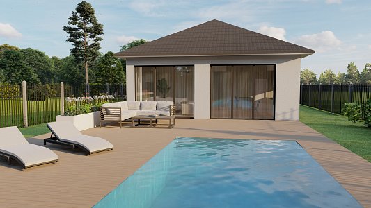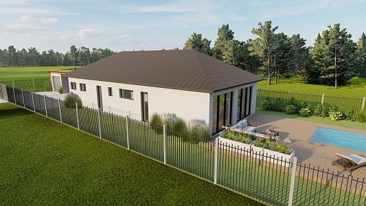 Projekt je zpracovaný na jednopodlažní rodinný dům o dispozici 5+kk a ploše 132,6 m². Dům plynule navazuje na garáž o ploše 21,2 m². Svým tvarem a orientací perfektně pasuje do geometrie pozemku a okolí. Uvnitř má dům 4 samostatné ložnice a 2 koupelny. Konstrukce domu je navržena z tvárnic Ytong.