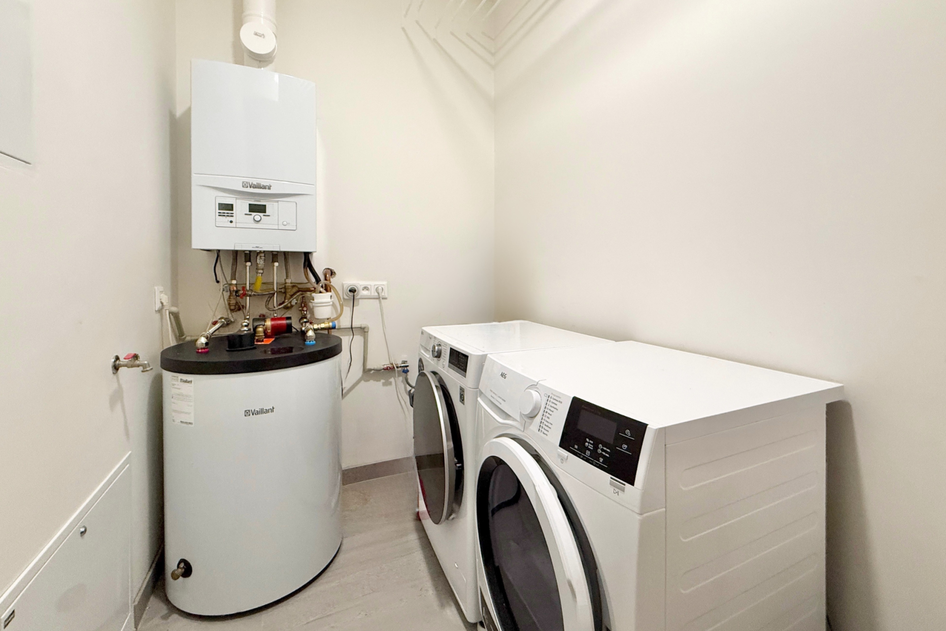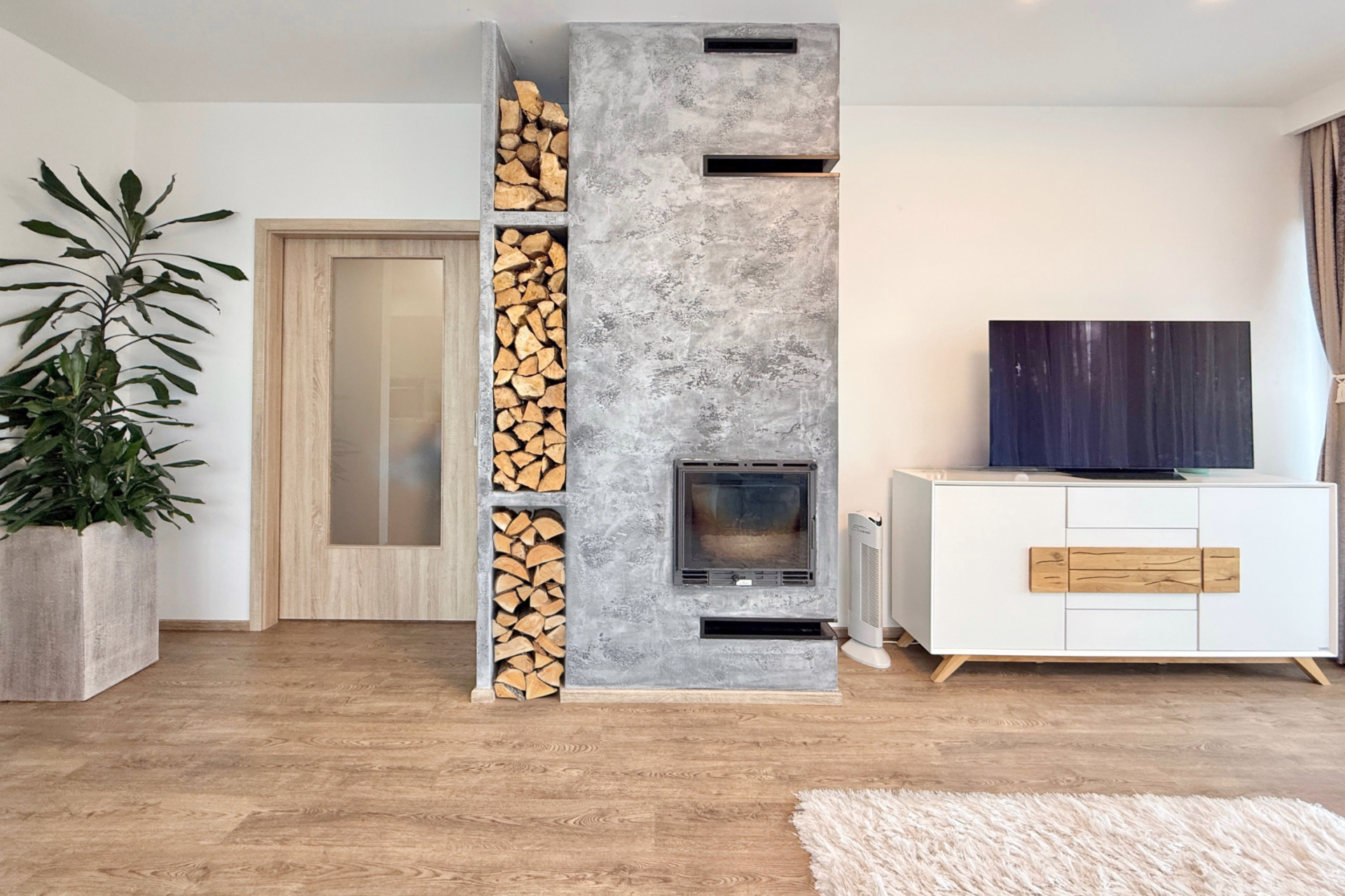 Vytápění domu je řešeno podlahovým topením v kombinaci s krbem v obývacím pokoji. V každé místnosti je termostat pro individuální nastavení teploty. Garáž je vytápěná pomocí radiátorů, takže ji lze využívat i v zimě. Zdrojem tepla je plynový kondenzační kotel.