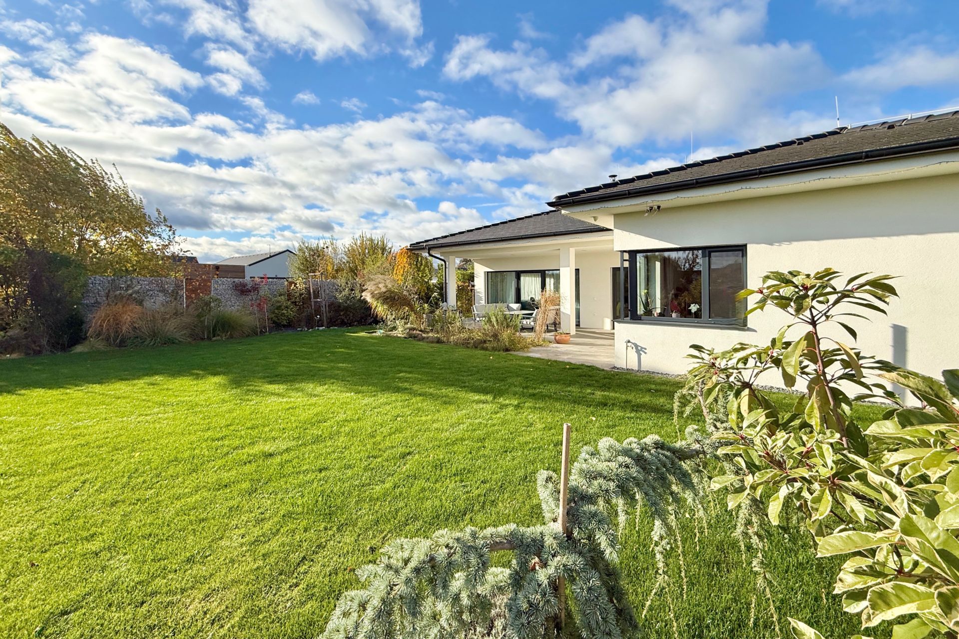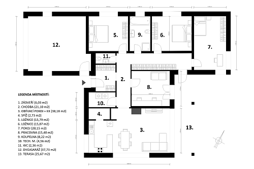 Dominantou je prostorný obývací pokoj s kuchyňským koutem a vstupem na krytou terasu orientovanou na severovýchod. Dále se v domě nachází tři ložnice, pracovna (také se vstupem na terasu), koupelna s vanou a sprchovým koutem, samostatné WC, technická místnost a spižírna. Garáž pro dvě auta je součástí domu. Součástí pozemku je také samostatný objekt (dílna) se dvěma místnostmi (po 11 m²).